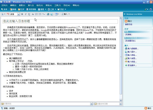 的确是所见所得的离线编辑器,感觉很好。日志的图片被增加到PicasaWeb上了,而且属性不是公开的。好吧,以后就 用这个来写日志了,微软的东西就是强。Google的东西就是会莫名其妙的撞墙,同时永远beta下去,不知猴年马月狗日的才更新一次。百度很少使用,感觉百度空间也很不错,百度IM不知道什么时候才能正式版?Gtalk啊,更加没有希望普及了,不普及的IM还有什么市场的?算了,还是用TM吧。